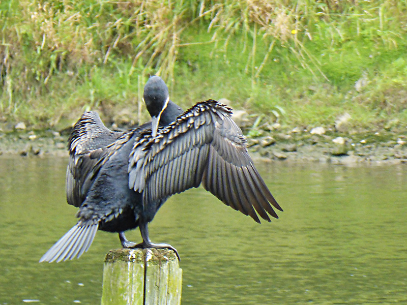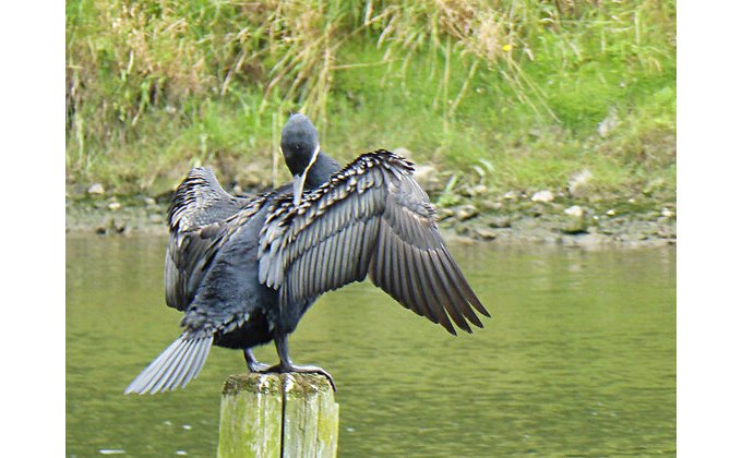 Le grand cormoran est fréquemment perché sur les pieux, ailes étendues pour les sécher. Contrairement aux autres oiseaux marins, il n’a pas le plumage gras et doit se sécher après s’être nourri. On peut aussi l’observer pratiquer sa technique de pêche : il bat des ailes à la surface de l’eau, affolant les poissons qu’il localise ainsi et qu’il peut ensuite attraper en plongeant. Il vole en rasant le plan d’eau.