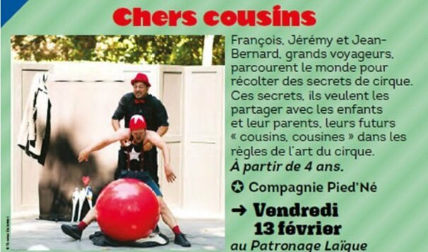 Vendredi 13 février, le Patronage Laïque du Bergot accueille le spectacle "Chers Cousins" dans le cadre du Festival Oups !. Ce festival, dédié aux (…)